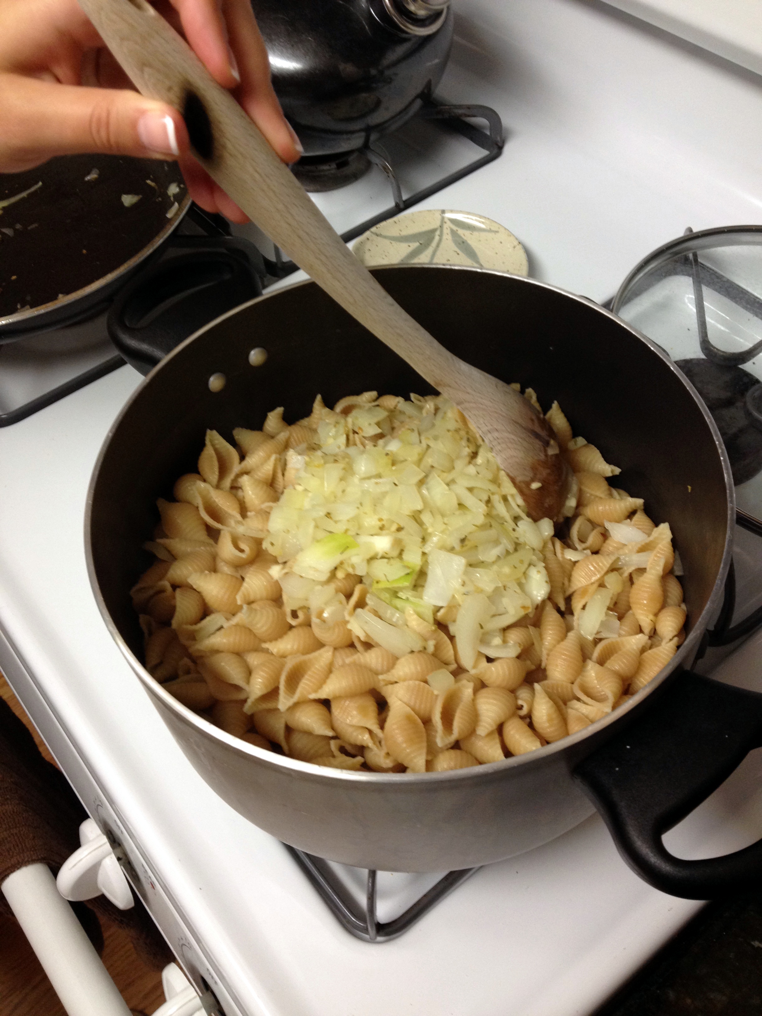 While pasta is cooking, add olive oil in a skillet on medium-high. Toss in chopped onion and sauté for 5 minutes. Add the garlic and oregano and cook for 1 minute, stirring occasionally Remove from heat.