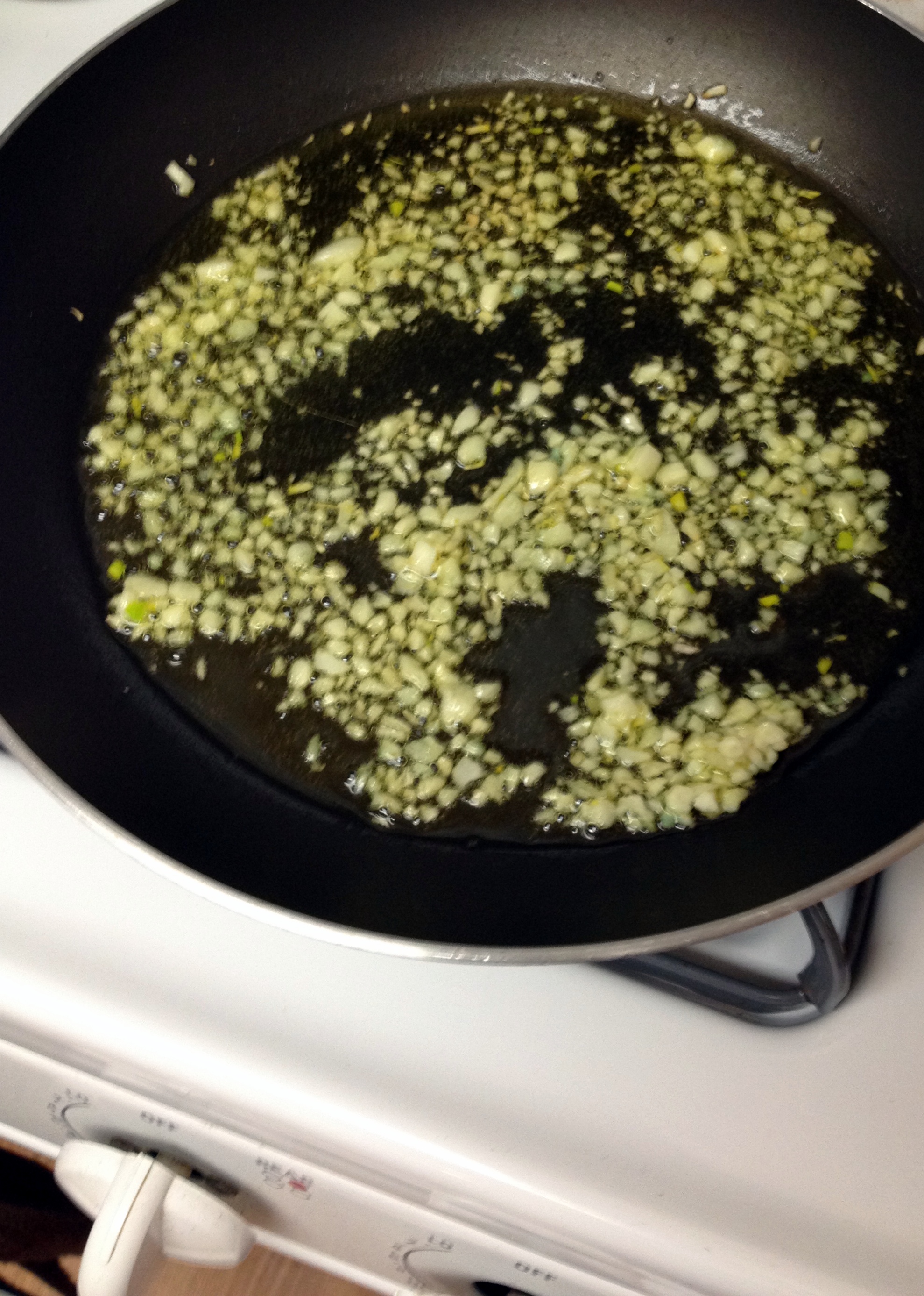 Heat a large skillet on medium. Add 3 Tbsp olive oil and the garlic. Stir around for 1-2 minutes until the garlic turns a little brown.