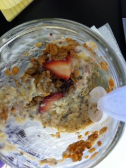 I slice the banana, add 1/3 cup rolled oats, 1/3 cup skim milk, and 1/3 cup low fat vanilla yogurt. Sometimes I do equal parts 1/2 cup of each when I’m feeling generous.