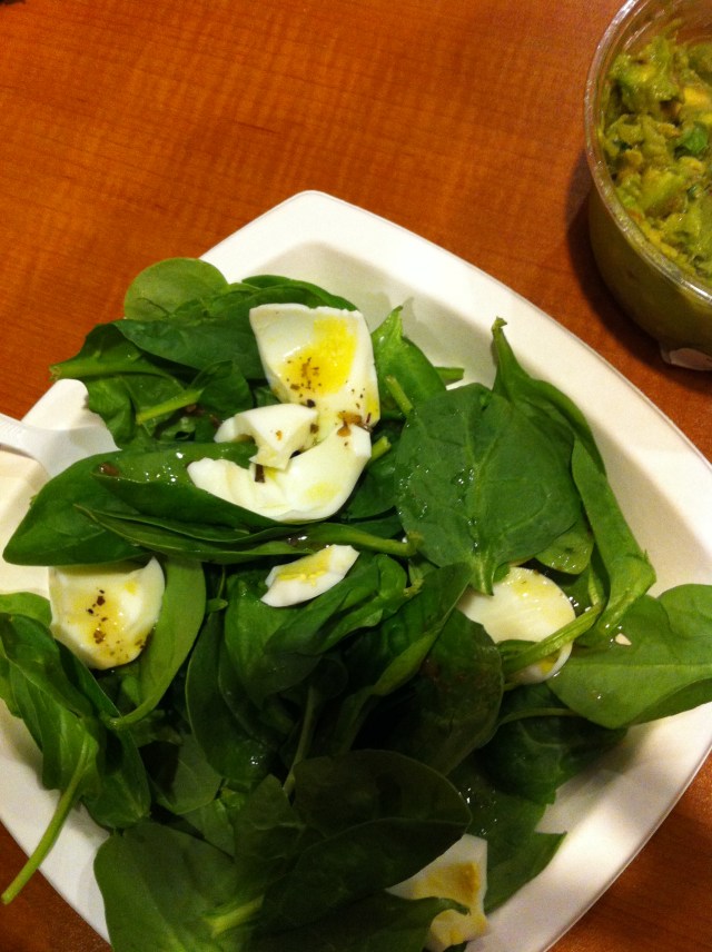 Spinach salad with egg whites and an Italian dressing with an olive oil base.