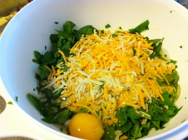 I hoofed it over to Whole Foods to grab the shredded cheese and eggs, and of course I forgot about the bread crumbs. Luckily, Tuna had his thinking cap on and remembered he had some pita chips in the pantry (he calls it the cupboard? WTF?) that we could crush up and use as bread crumbs. The substitution worked just fine.