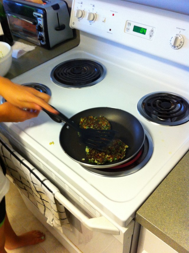 Tuna was nice enough stir up everything in the bowl and make the patties for us so I didn’t even have to get my hands dirty. Bwahaha (evil laugh.)