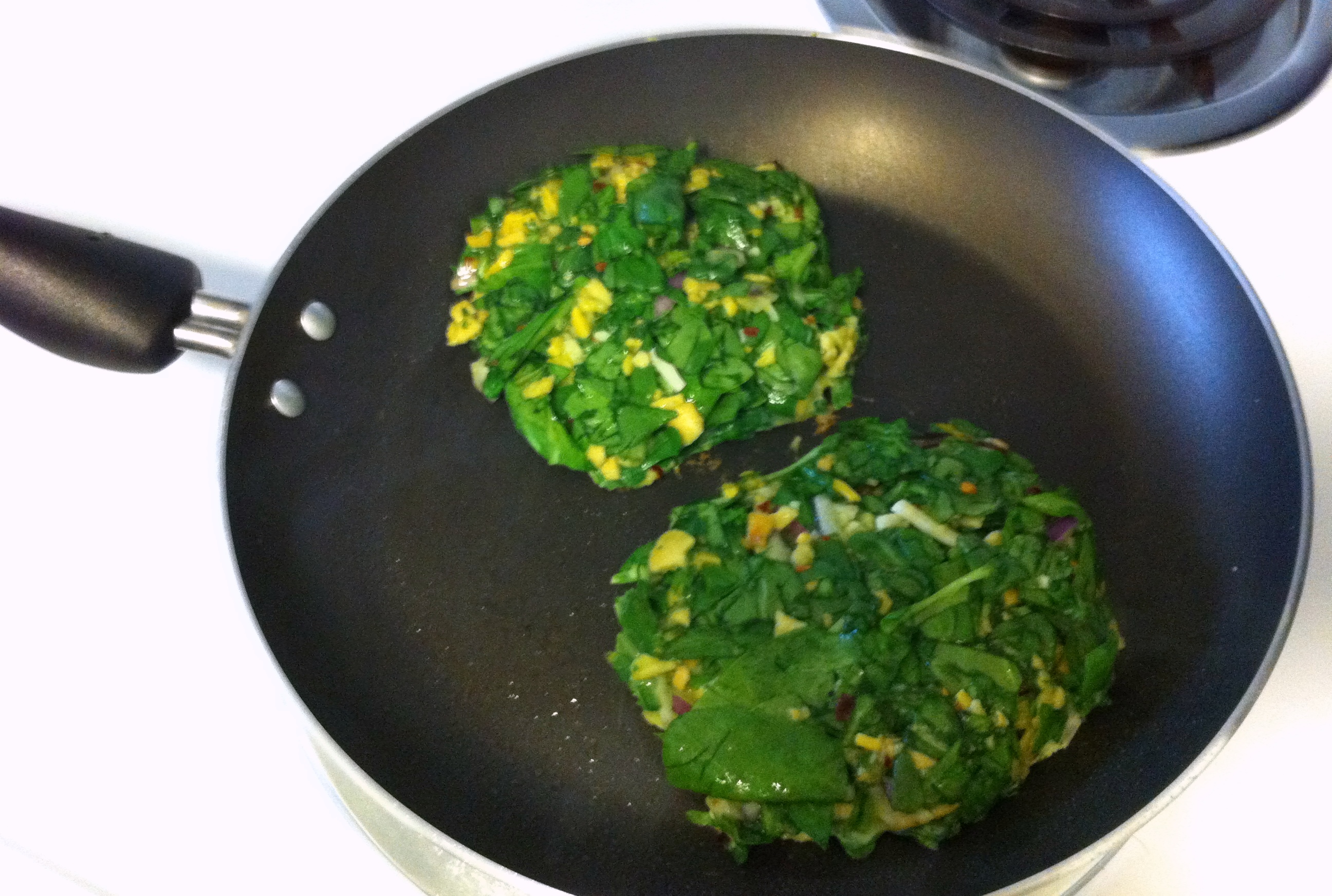 We were both pleasantly surprised how our spinach burgers turned out! Tuna said that the only drawback is that it gets a little smoky in the kitchen, so make sure to open a window if you are one of those people who always sets the smoke alarm off who has a sensitive smoke alarm.