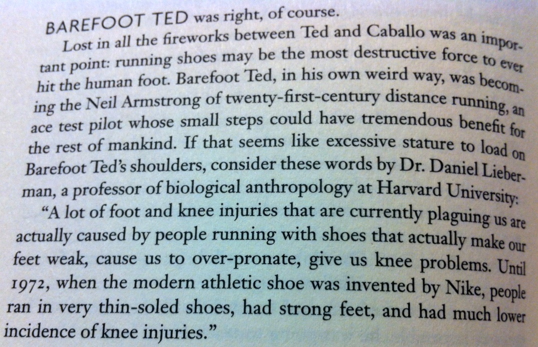 Born to Run also explains the ideology of barefoot running, which I am now obsessed with. This doesn’t mean actually running barefoot, except for Barefoot Ted, who would run up the canyons literally in bare feet, nor does it necessarily mean running in sandals or Tevas like the Tarahumara or the main gringo ringleader, Caballo Blanco.