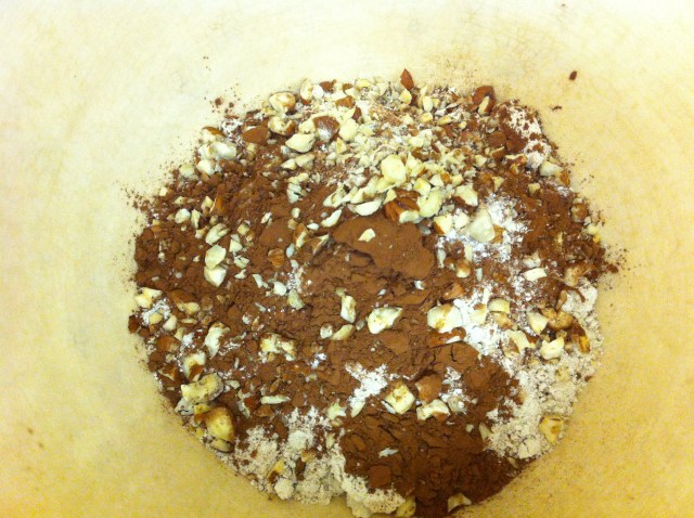 Put the flour, hazelnuts, cocoa powder, and baking powder in a large bowl and mix together.
