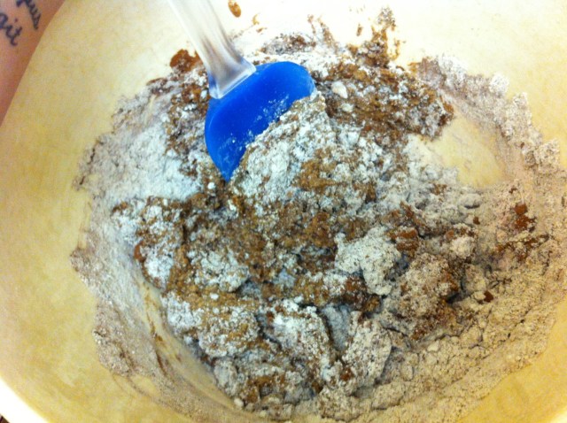 Dump the wet bowl into the dry bowl and keep on stirrin’.