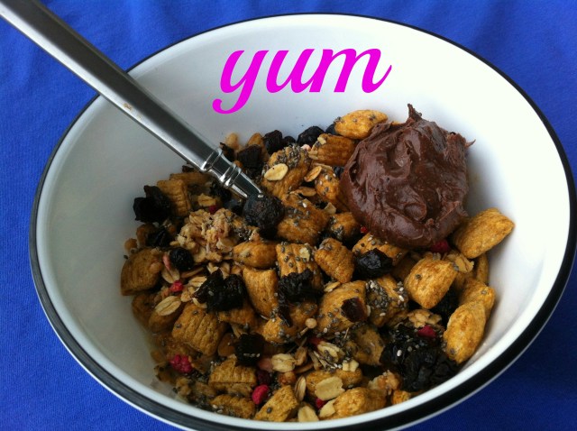 Dinner tonight was a keeper for sure. Puffins with milk, granola, chia seeds, prunes, and a dollop of dark chocolate dreams peanut butter. Mental note to self – buy more than one box of Puffins at a time. I go through those things at a ridiculous speed.