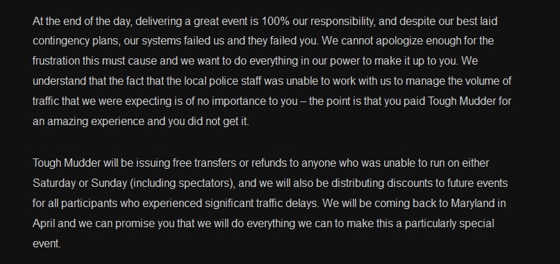 On Sunday, Tough Mudder released a statement of apology on their website regarding the traffic problems and other event issues.