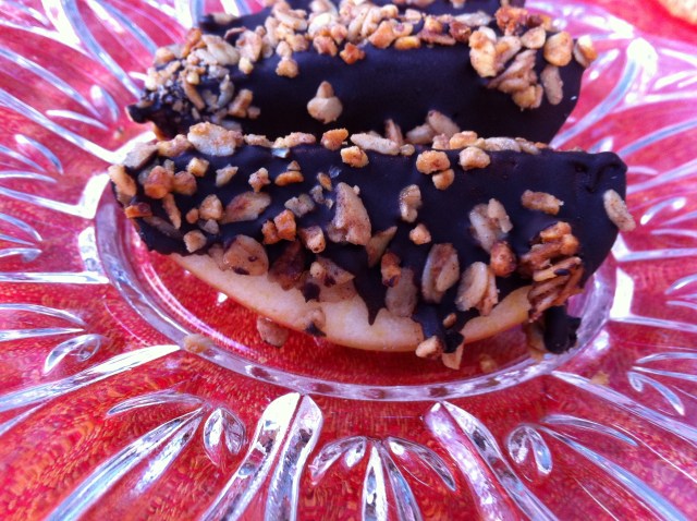 Pour granola on a plate or in a shallow bowl. Dip the chocolate covered wedges into the granola.