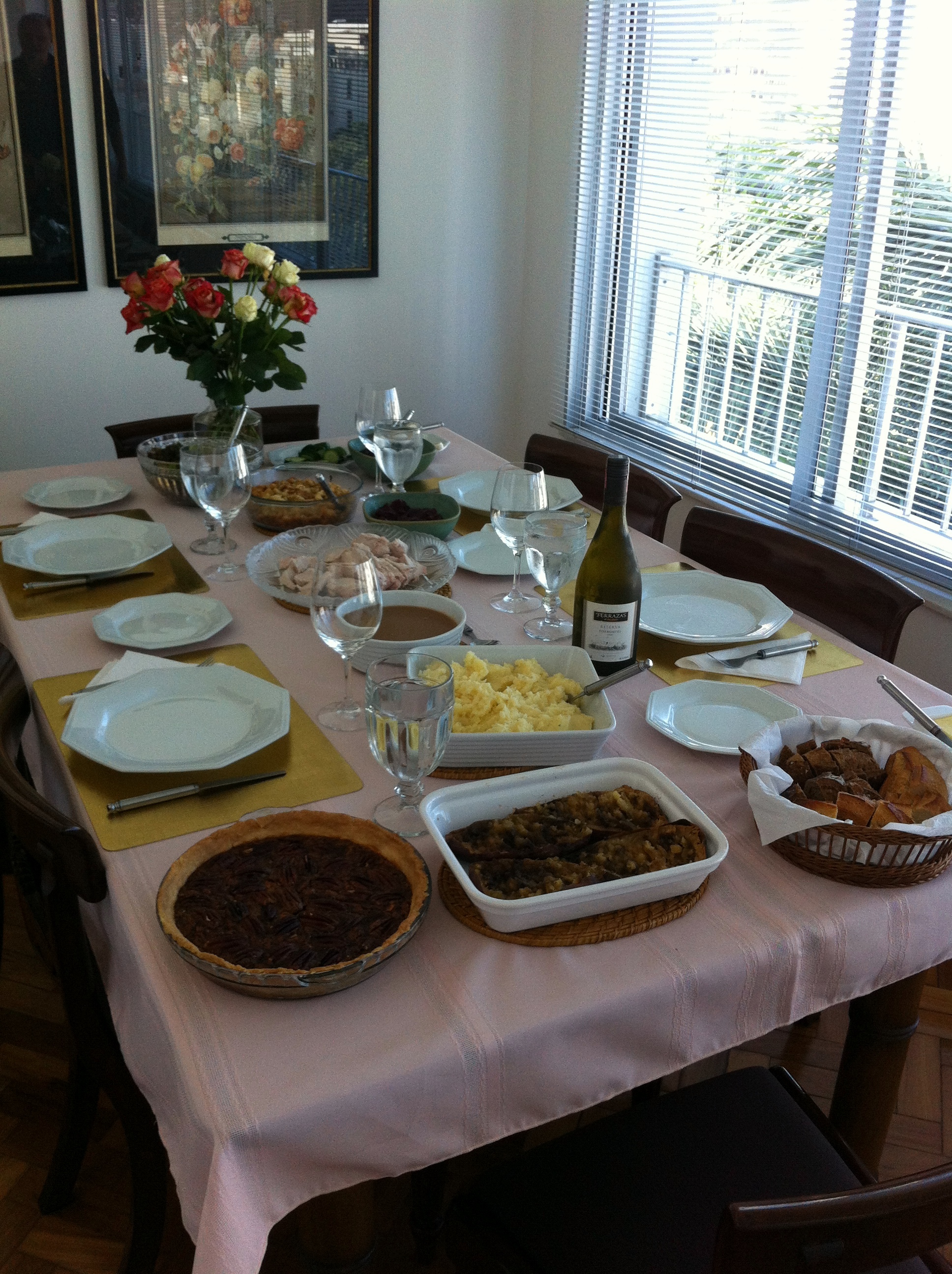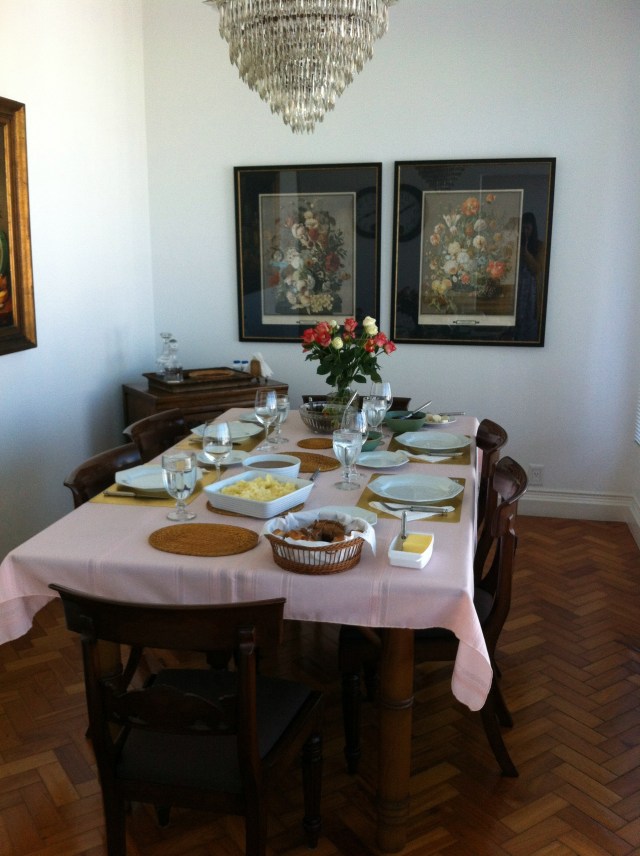 I think spending Thanksgiving on the beach should be a new tradition. Tuna, his dad, and I spend the day at the beach in Leblon while his awesome mom slaved away in the kitchen (with no air conditioning). Tuna’s mom had a serious task ahead of her – having to make a turkey, pie, etc all in a stove that heated to ranges of temperatures instead of a specific temperature. Oh yeah, and all of those temperatures were in Celsius. At least we helped set the table!