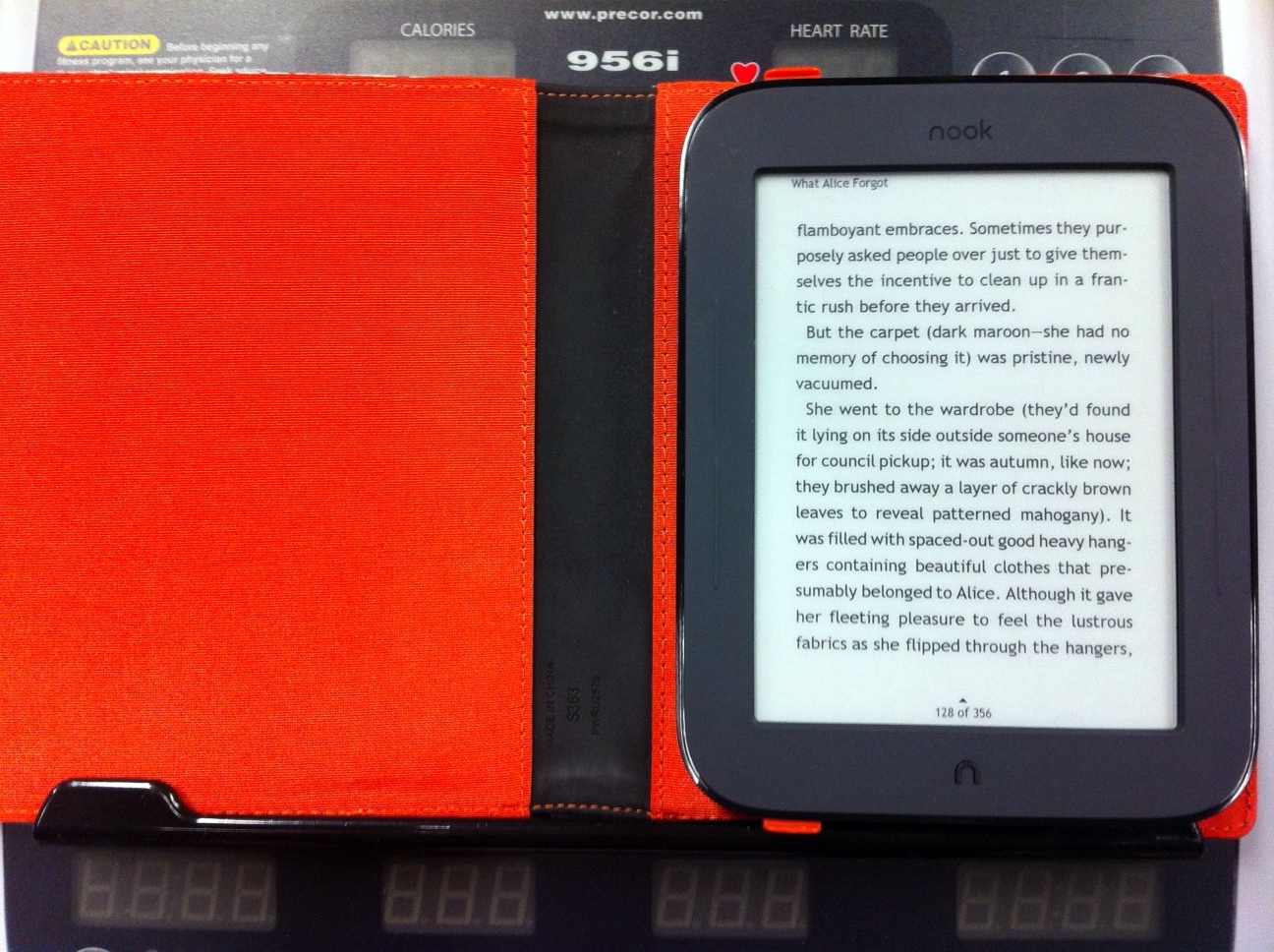 Keep in mind I’m reading on my nook! I think it would be a lot harder to read an actual book while running – but I haven’t tried it, so who knows.