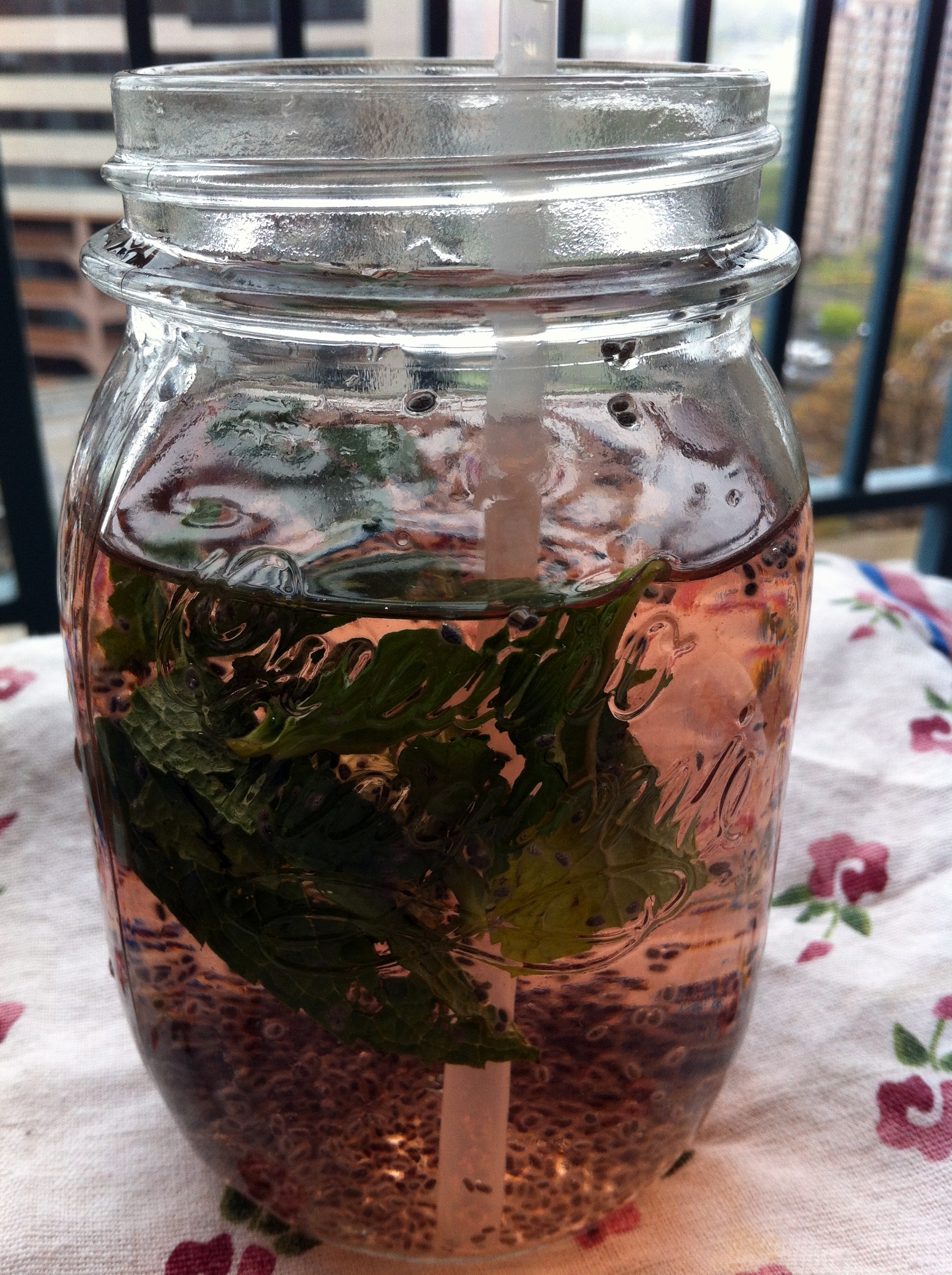 I’m trying not to drink soda anymore, hence the poor man’s flavored water theme. Just add a little bit of pom juice, a spoonful of chia seeds, and a few sprigs of mint. Done.