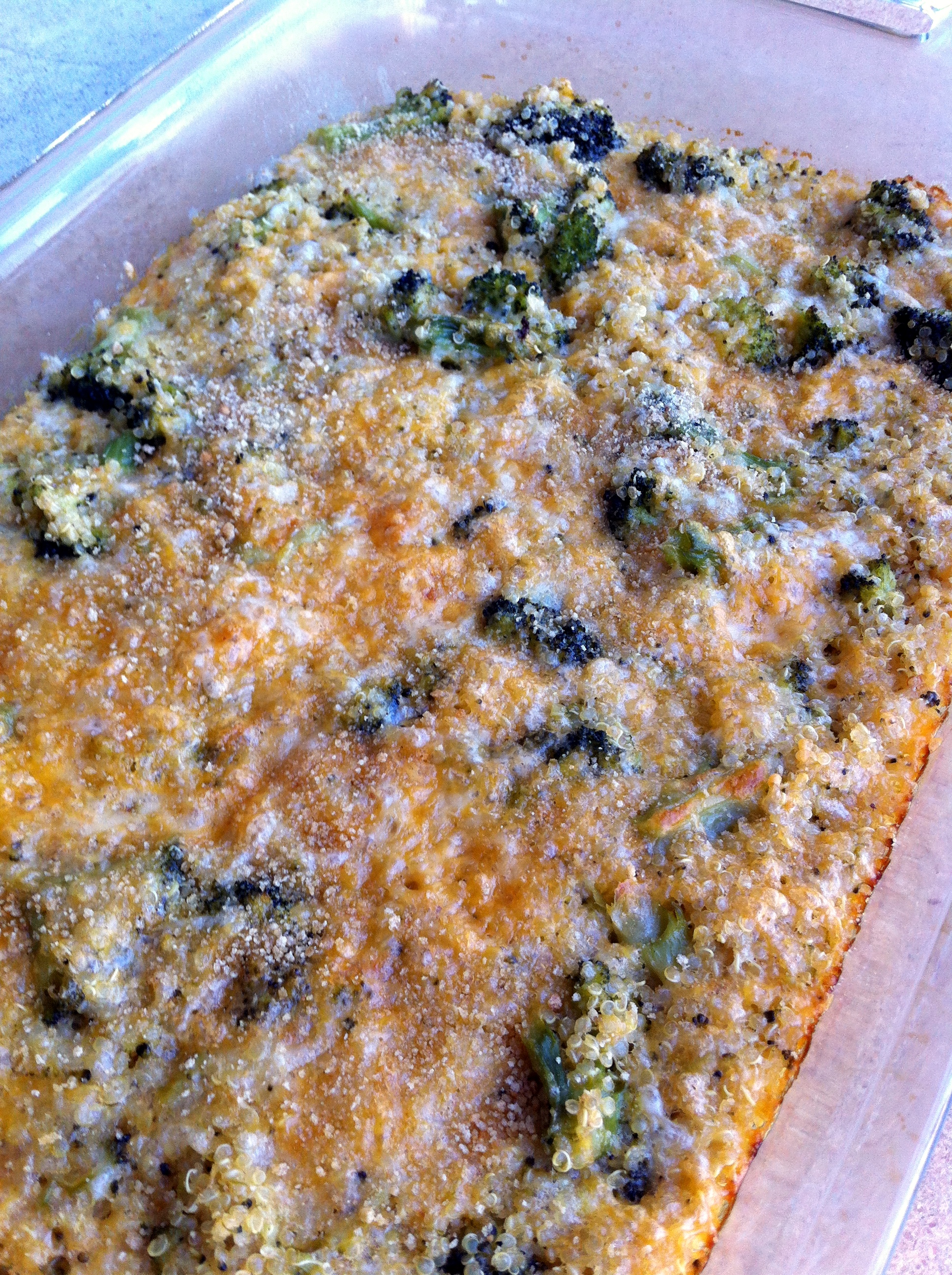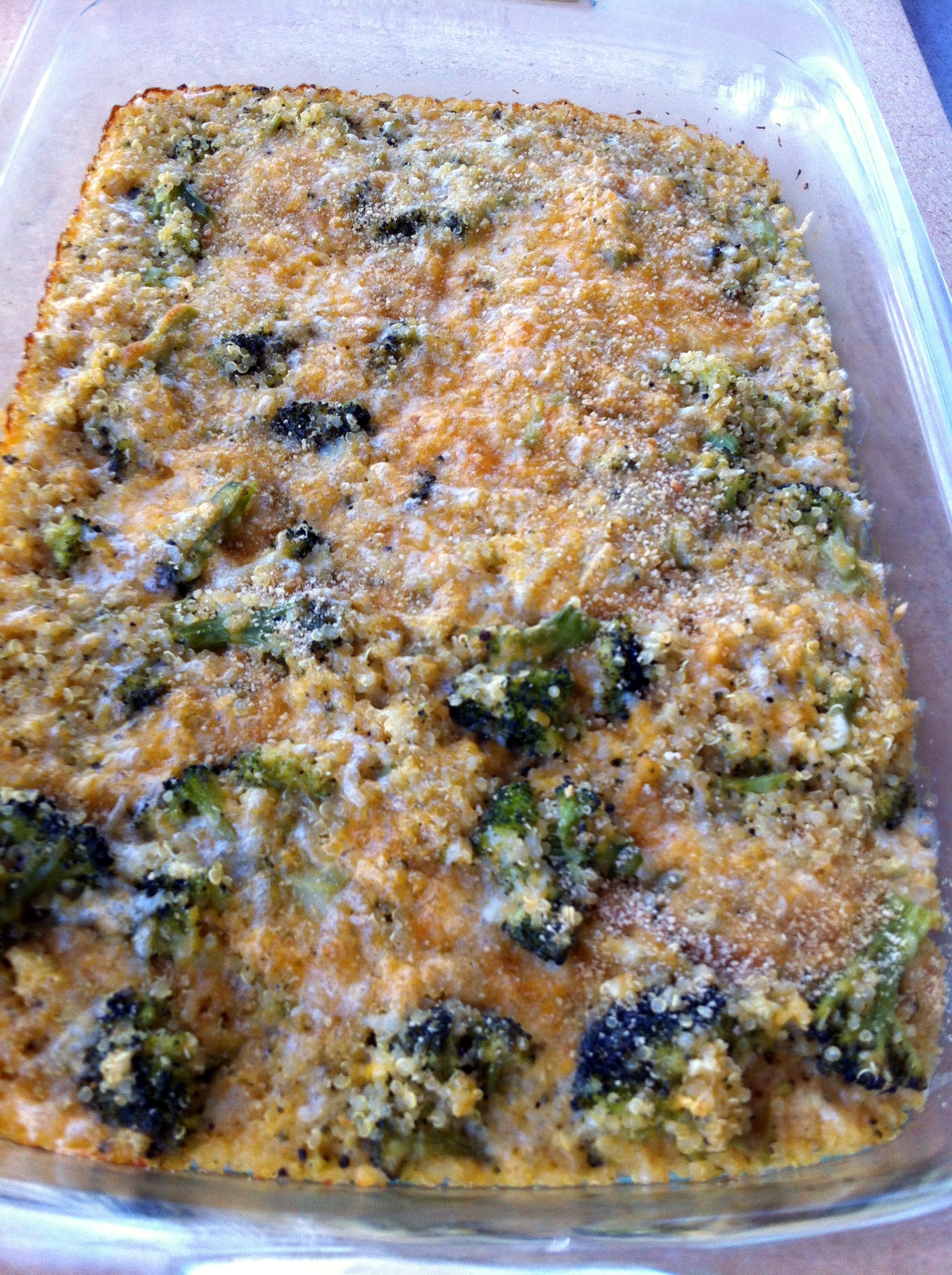 In a large bowl, combine the vegetable broth, mayonnaise, milk, 1 1/4 cup shredded cheese, Splenda, and pepper until mixed. Stir in the quinoa and broccoli.