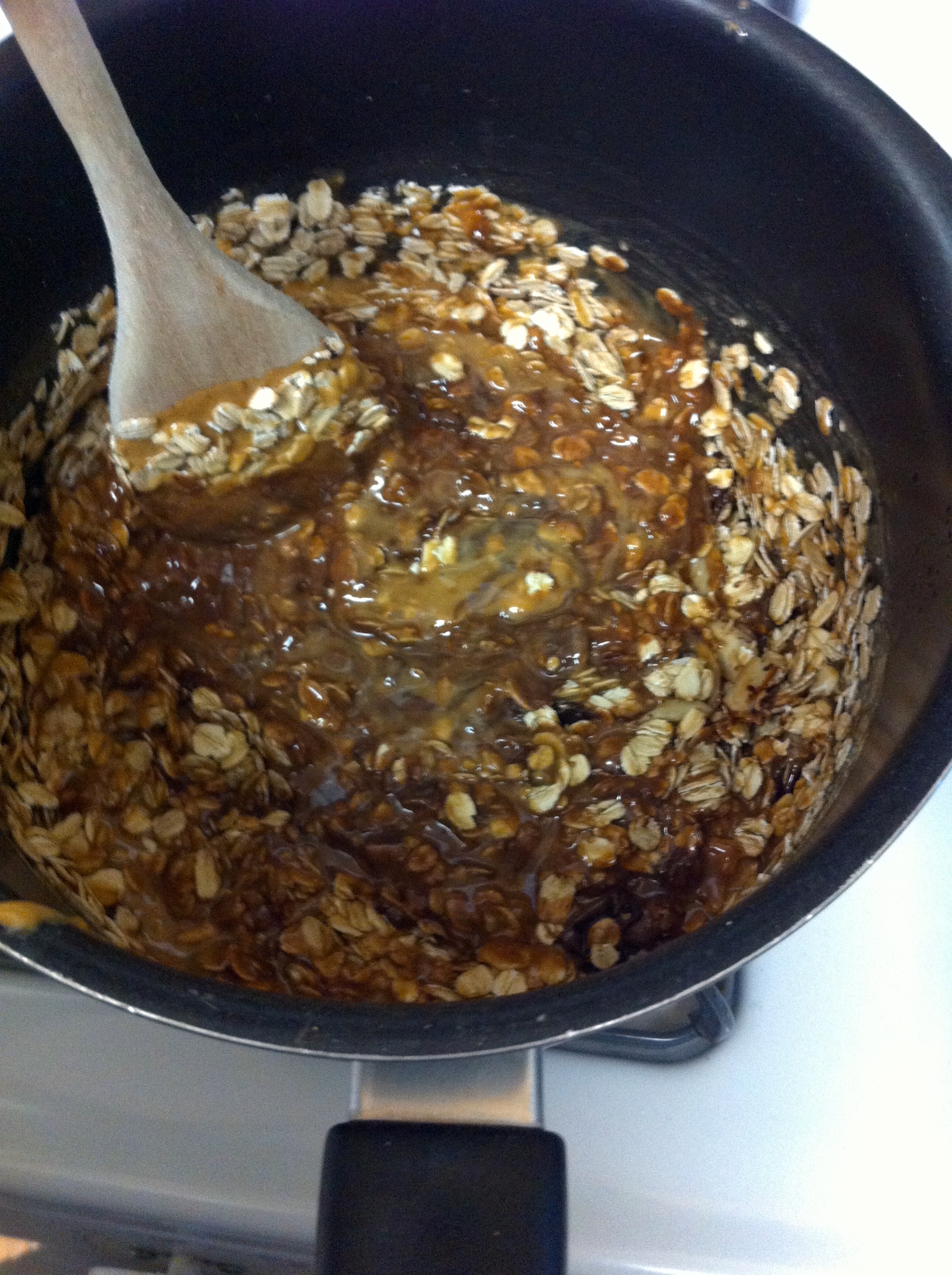 Remove from heat. Add dark chocolate pieces, oats, and vanilla extract and combine until melted.