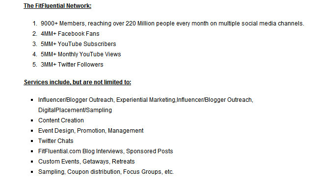 FitFluential is a “nationwide network of highly influential fitness enthusiasts sharing their journey both online and offline through multiple social media platforms….FitFluential was designed to connect health and wellness brands with their ideal target market through customized, long-term experiential and contextual marketing campaigns.”