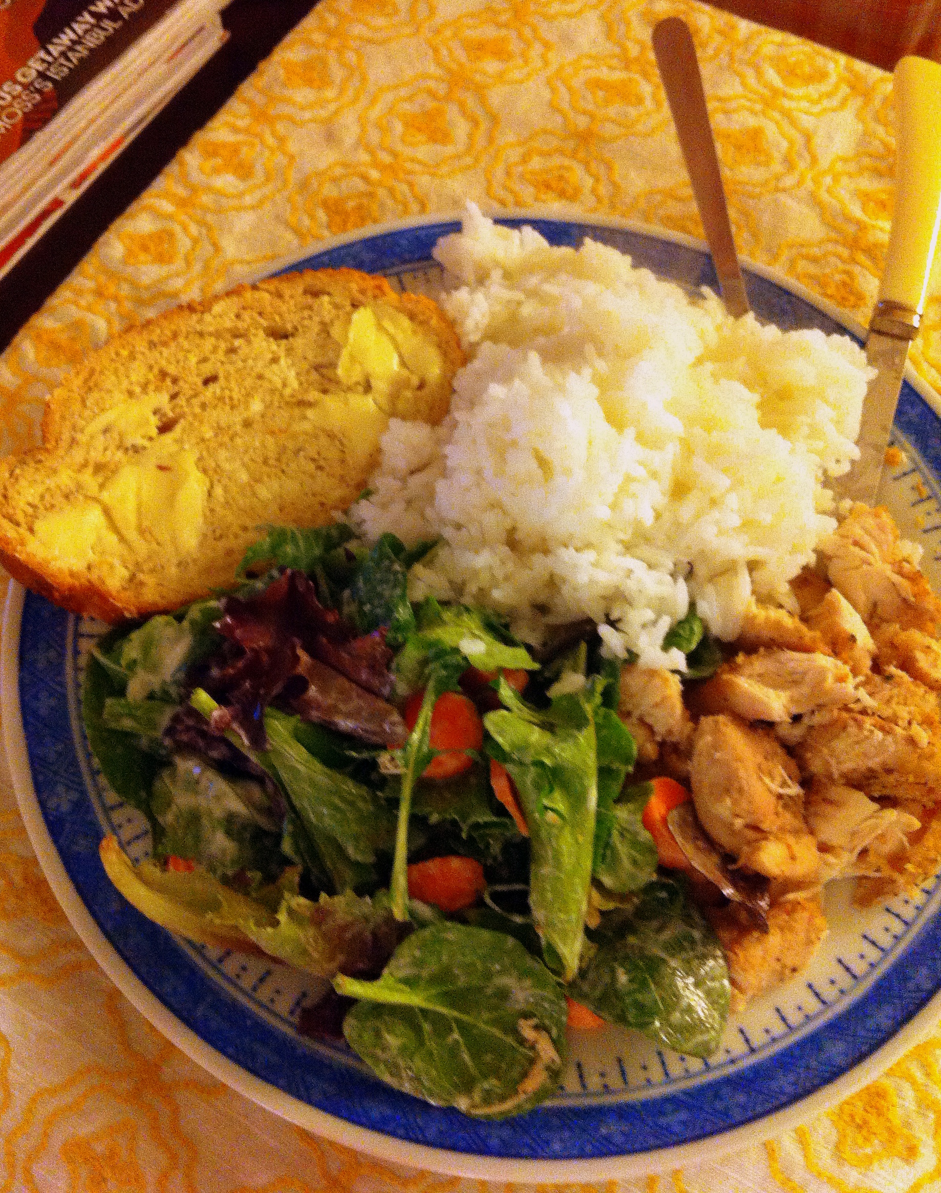 (whole wheat bread & earth balance, brown white rice, baked chicken, and salad)