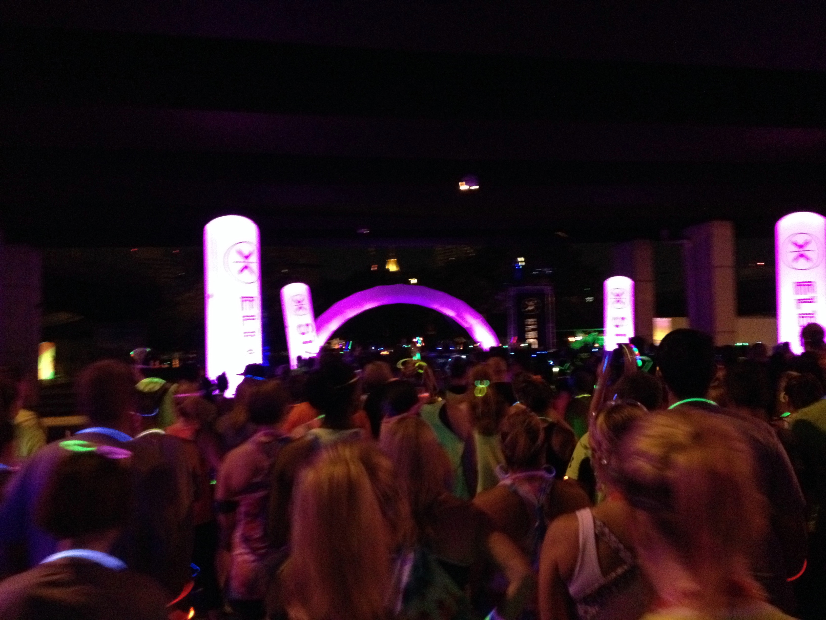 They stuck us in a chute of sorts to wait in line to start the run in waves. We waited about fifteen minutes or so to start. It wasn’t too long to wait though because crazy techno music was playing and people up on balconies were chucking glow sticks everywhere.